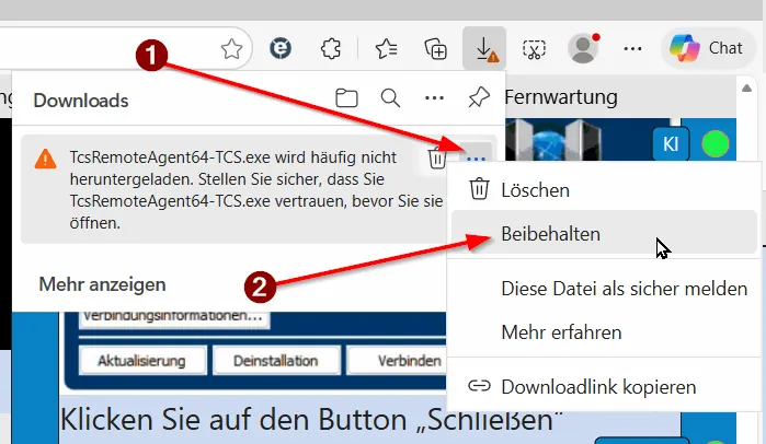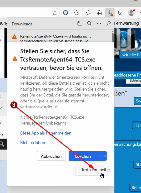 Ein neues Fenster öffnet, darin dann bei Pfeil „3“ den Punkt „Trotzdem beibehalten“ klicken: